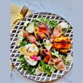 Stone Fruit, Burrata, Prosciutto Salad: Delicious salad with stone fruit, creamy burrata cheese, and prosciutto dressed in a playful pistachio pesto vinaigrette